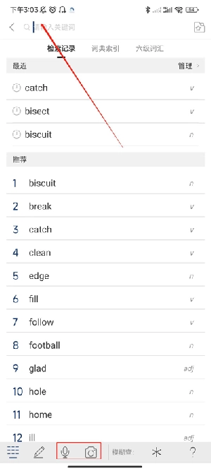 1、进入首页,在搜索栏的文字框中输入单词或句子,即可查询翻译。点击麦克风按钮能进行语音输入,点击相机按钮则可进行拍照翻译。