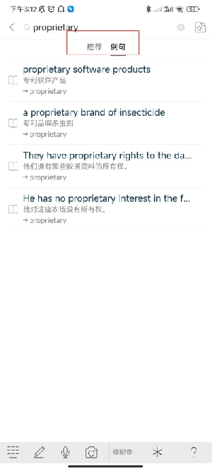 2、输入需要查询的单词后,可以看到下方有推荐例句,点击需要查看的翻译即可浏览详细信息。