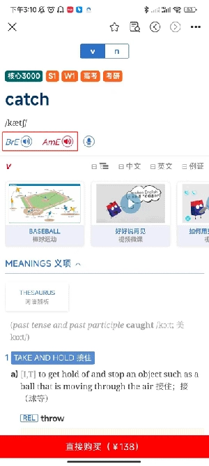 4、点击界面中的喇叭按钮,可以听到次单词的发音。而蓝色按钮为英式发音,红色按钮为美式发音。
