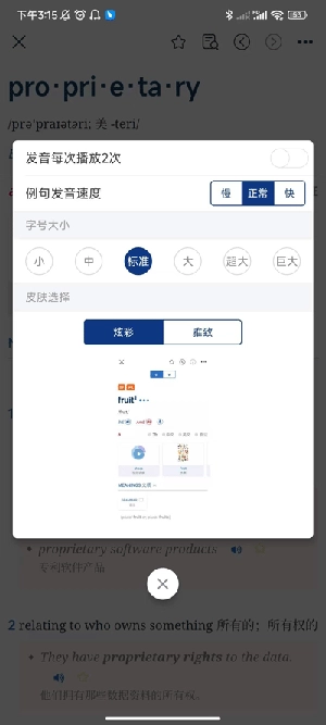 5、点击右上角的三个点按钮打开设置界面可以调整发音速度、设置APP皮肤、字号大小等。