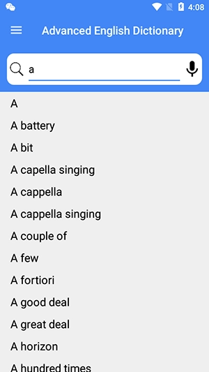 这是一款适用于广泛受众的实用英语学习应用程序。您可以使用它来搜索您不知道其含义的单词。只需在搜索框中输入该词即可。您已经知道它的重要性和用法。最令人难忘的是,您无需上网即可搜索新术语。这为许多用户创造了随时随地使用它来学习词汇的机会。