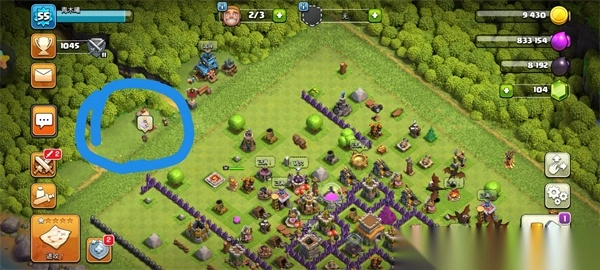 2、查看村庄地图,“建筑工人小屋”(或隐藏建筑)在蓝色圈定处,优先对其进行升级,从而解锁更多建筑工人,同时留意金矿。