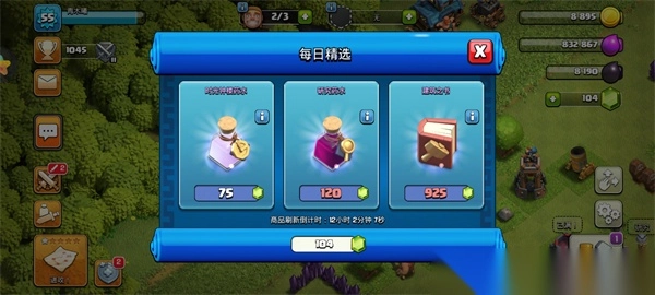 1. 在每日精选页面,首先领取“免费”的训练药水(此药水可加速造兵),当资源不足时,购买“资源药水”(需花费115宝石)。