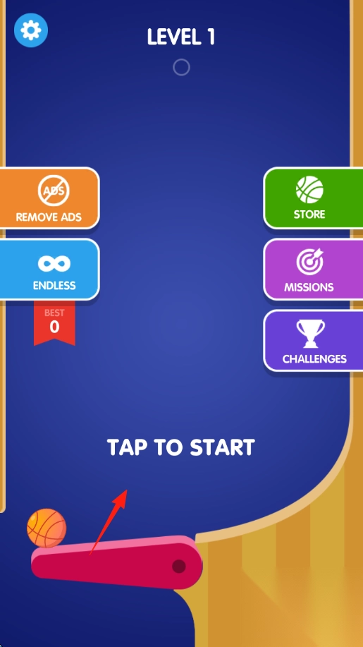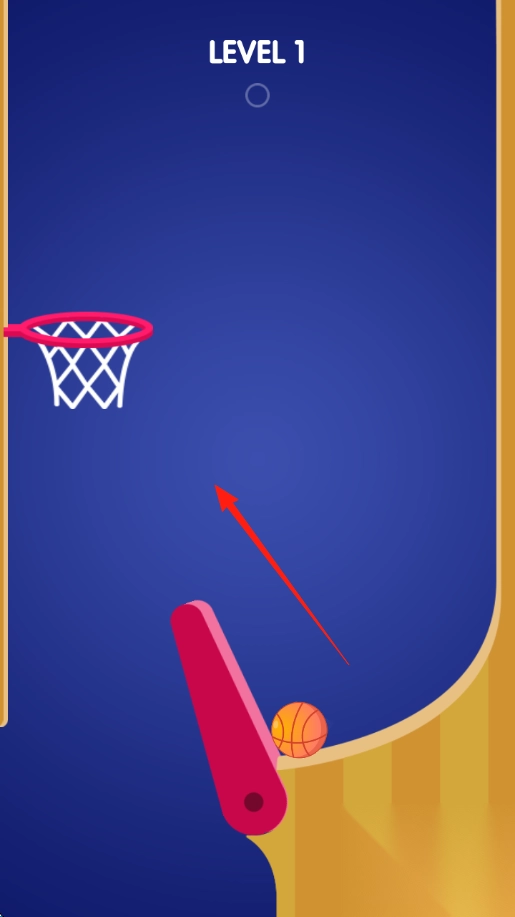 2、投篮操作通过点击控制红色弹射器,调整角度、力度,将篮球射向篮筐,需精准命中,完成“LEVEL1”挑战。
