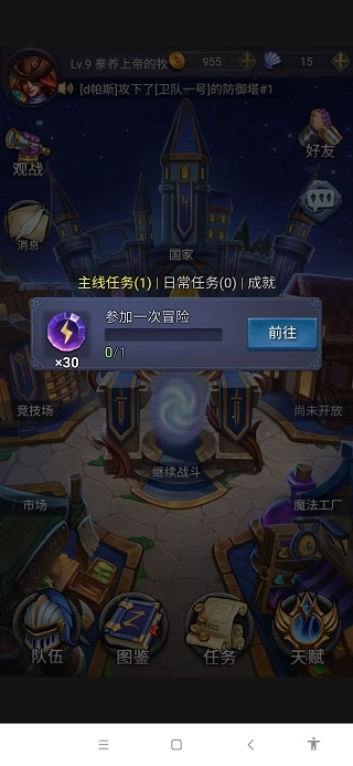 这是当下的基础,接下来我们介绍设施。当下的基础设施包含竞技场、冒险、市场、魔法商店以及国战。
