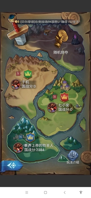国战玩法介绍:游戏中设有三个国家,玩家可择一加入。每晚国战开启后,玩家能获取积分,这些积分将决定奖池金币的瓜分份额。无论是攻城还是开城操作,均可赢得积分。值得一提的是,每个国家都会依据本国获得积分最多的那位玩家来命名,这无疑是一个能让玩家扬名立万的绝佳之地。