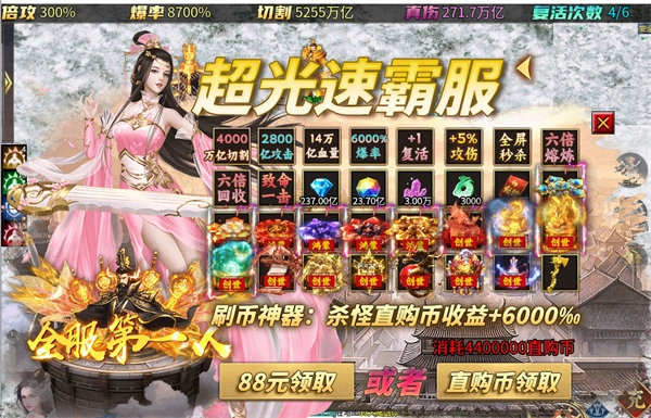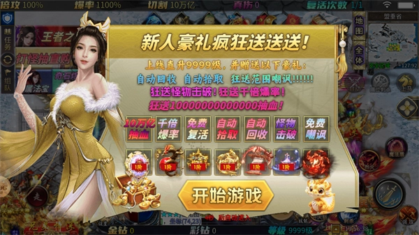1、充值比例1:1,上线即领万亿切割、范围嘲讽技能,还能直接直升9999级!