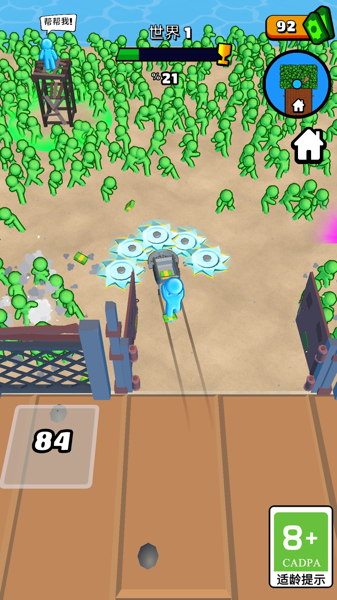 《疯狂战斗机》是一款玩法轻松简单的射击类末日生存割草游戏。在这个被僵尸占领的世界中,你将操控角色在遍布绿皮僵尸的场景里奋勇杀怪、艰难求生。游戏过程中,你可以解锁各式各样的武器,不断升级强大技能,还能救援被困的同伴,一路砍杀冲破汹涌尸潮,尽情体验刺激十足的末日割草爽感。