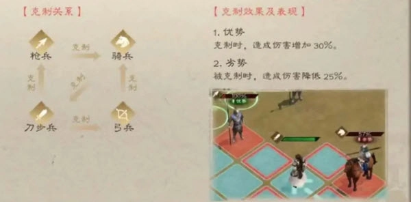 枪兵与弓兵对骑兵有克制作用,骑兵克制步兵,而步兵则克制枪兵和弓兵,三者构成一个三角循环的克制关系(这是新手需要留意的要点)。
