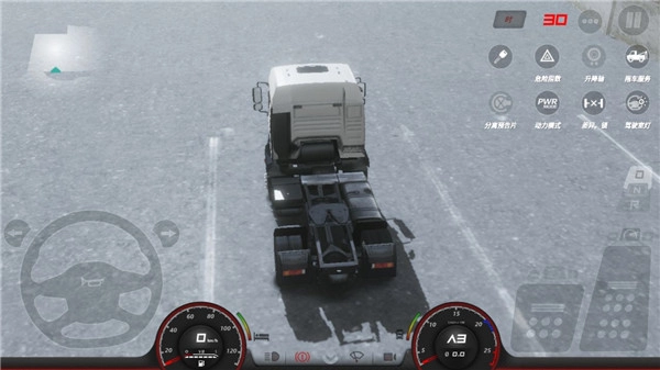 2、点击右上角的菜单按钮,接着点击左侧的钥匙图标来启动卡车,之后就可以通过踏板进行操作了。其中,方向盘对应坐标位置,右侧是刹车和油门踏板,而油门的上方则是前进挡和倒挡的切换区域。