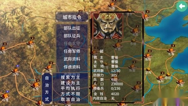游戏开始阶段,要是只有君主一人,是无法直接执行搜索指令的。不过玩家可以在大地图的城市里设置内政自治,把方针调整为搜索,等年底进行评议时启用内政自治,再借助S/L大法,就有一定概率自动搜索到一名武将。