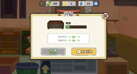 当攒够一定数量的金币后,就能对餐车、制作工具和各类食材进行等级提升,从而扩大店铺的运营范围和业务规模。