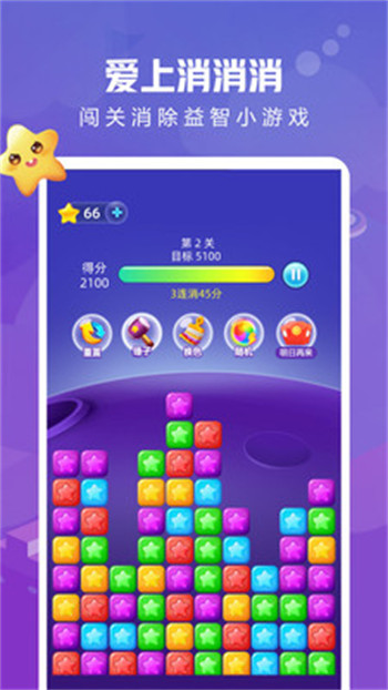 《爱上消消消红包版》是一款玩法简单的休闲游戏,经典的消除模式可以随意体验。游戏内设置了丰富的任务等待完成,各关卡设计得轻松有趣,玩家可以不断挑战闯关,过程中还能获得不少红包奖励。