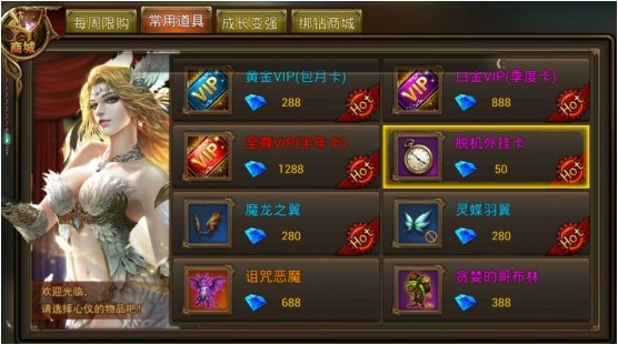 3) 也能够直接前往商城进行购买,花费50钻石就能得到1张时长为5小时的挂机外挂时间卡。