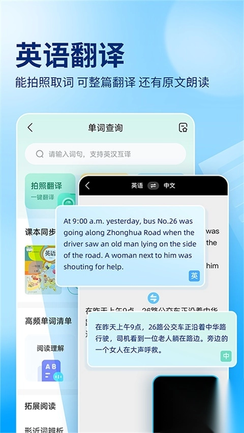 4、单词查询:阅读遇到陌生英文单词?写作文想不到单词怎么说?不用慌,中英互译,长句短句,单词查询通通帮你搞定。
