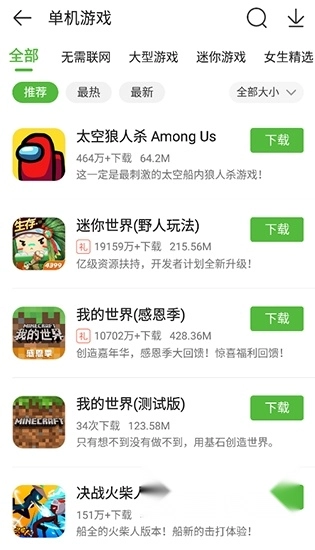 2、点击“单机”选项,挑选自己心仪的内容,点击其后方的“下载”按钮,就能下载到手机上,开始畅玩啦。