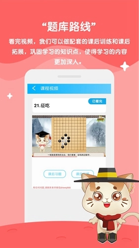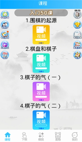 2、课程板块设有学前必看、进群学、每日签到、兑换礼品、围棋的起源等内容,此外,还能通过观看视频学习围棋知识。