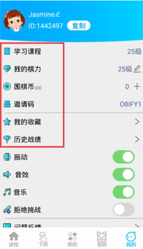 5、点击“我的”,即可查看学习课程、个人棋力、围棋币以及历史战绩等内容。