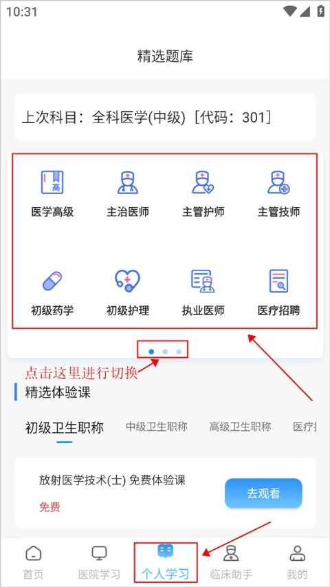 在页面底部找到“个人学习”板块,接着按照自身需求,从“医学高级”“主治医师”“主管护师”“主管技师”,或是“初级药学”“初级护理”“执业医师”等科目里挑选合适的进行选择。