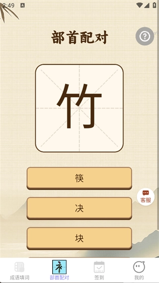 点击页面下方的“部首配对”按钮,就能开始作答汉字部首配对的题目了。