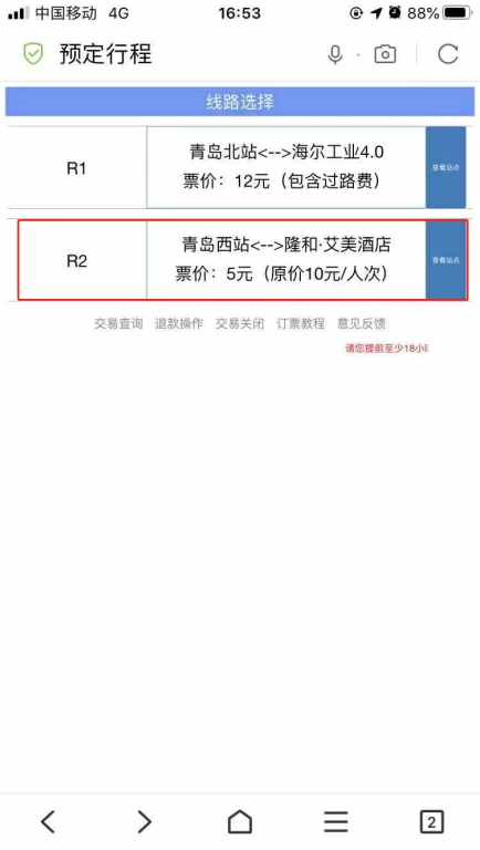 在“定制出行”页面里,选定“青岛西站--隆和艾美酒店”这条线路。要是想查询其他线路,可在搜索框中输入线路名称或者线路编号来查找。