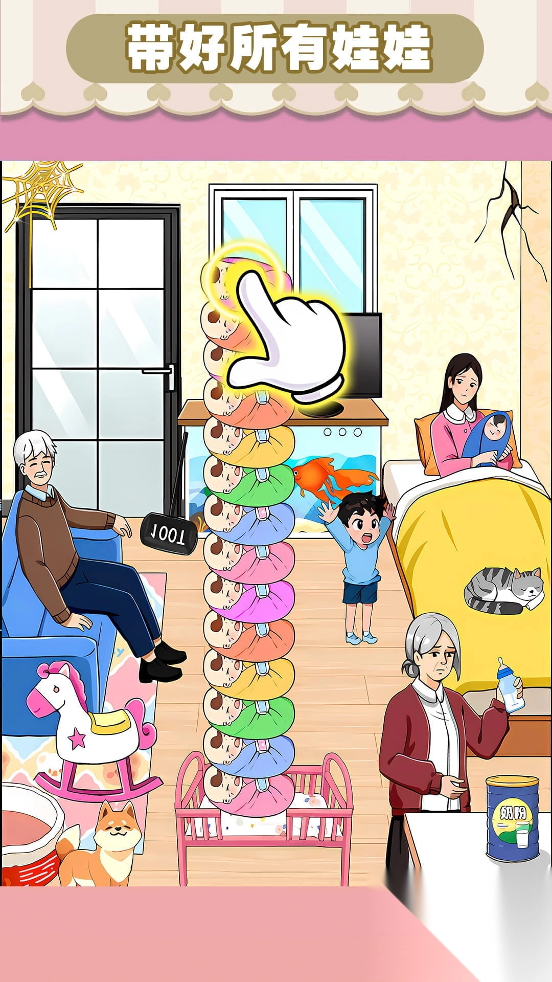 1. 宝宝们正在哭闹,玩家得运用各式各样的方法哄宝宝安静,通过合理利用道具来完成极具挑战性的烧脑任务。