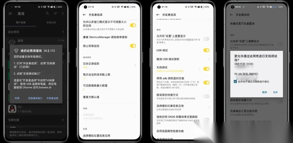 ①开发者选项-点击进入无线调试-三指上滑使用应用分屏