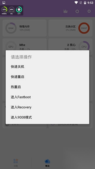 而在概览模块中,用户可以查看手机的物理内存,cpu运行,手机电量、温度、型号以及开机多长时间等信息。