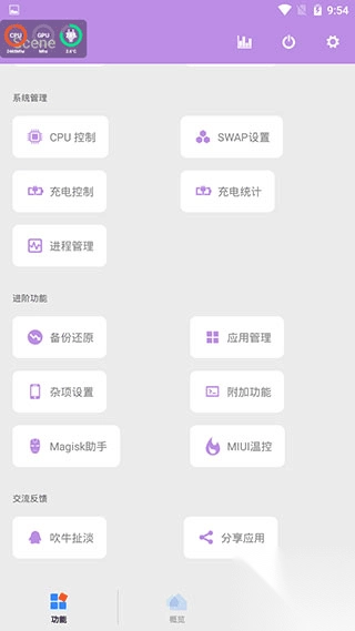 在功能模块中,用户可以进行帧率记录,充电统计,耗电统计,应用管理,活动/服务,温控编辑以及屏幕测试;