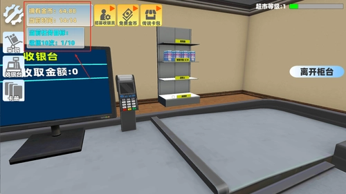 2、在操作方面,通过点击并拖动的方式来调整货架布局。界面右侧的按钮,其功能是用于结账收银。而在界面顶部,则会显示当前的资金与库存状况,以便使用者能够随时进行查看与调整。