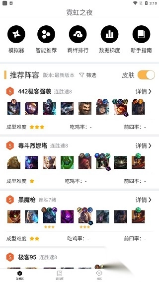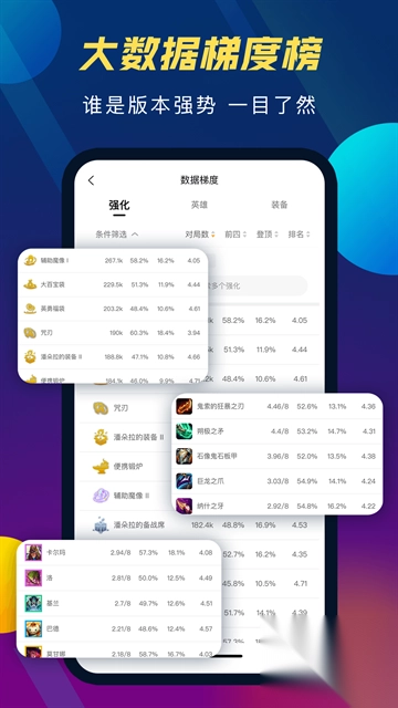 3、游戏数据查询:英雄装备数据、评级,羁绊职业数据,天选概率等各种数据一应俱全。