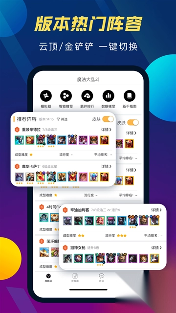 TFT云顶攻略助手官方版,堪称热爱云顶之弈(金铲铲之战)玩家上分的不二神器。它融合了游戏攻略、资讯以及社区等多种实用功能,涵盖海量游戏数据,像装备合成、装备属性、英雄羁绊等内容应有尽有。不仅如此,玩家还能在此查询最新热门阵容攻略,进行模拟阵容站位,获取阵容智能推荐,助力轻松上分,畅玩云顶。这里更是各路大神云集之处,每日都会有攻略讲解更新,同时提供最新游戏补丁的资讯。玩家只需一键,就能在云顶之弈与金铲铲之战模式间自由切换,获取所需内容。目前,金铲铲之战攻略正火热同步更新,喜爱这款游戏的玩家,赶快下载体验吧!