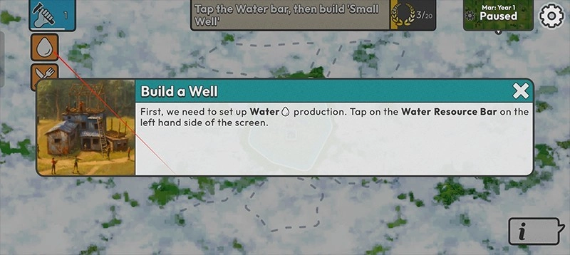 4、首先建造一口水井,点击左侧的水资源栏。