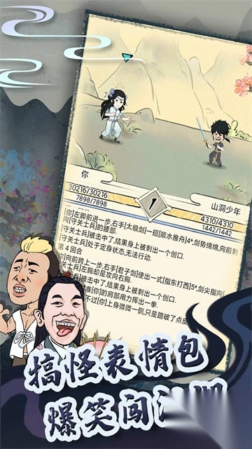 暴走英雄坛九游版,是于九游平台发布的一款武侠类RPG游戏,题材为“冒险生存”。它把“暴漫风的奇葩、逗笑”等元素,深深融入到中国人骨子里的武侠文化之中。游戏运用经典的剪纸手绘风格,并搭配搞笑表情包元素进行打造,让游戏场景显得简约又清新,角色诙谐搞怪,再配上幽默有趣的段子,为玩家构建出一个全新的逗趣江湖。