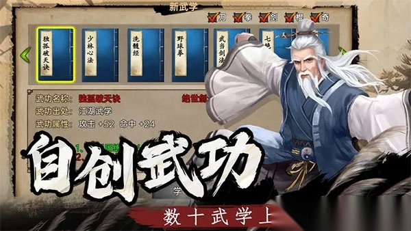 功法研习:除主角之外,每位侠客皆拥有各自对应的专属功法。专属功法具备属性加成效果。除专属功法外,其他各类功法同样需要学习并实现突破,以此提升相应的修为。其中,外功修为的提升能够增加伤害;轻功修为的提升可增加破击与格挡能力;内功修为的提升则能增加减伤效果。