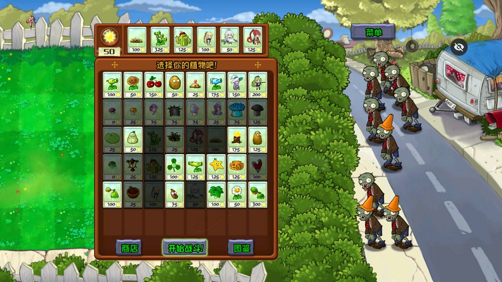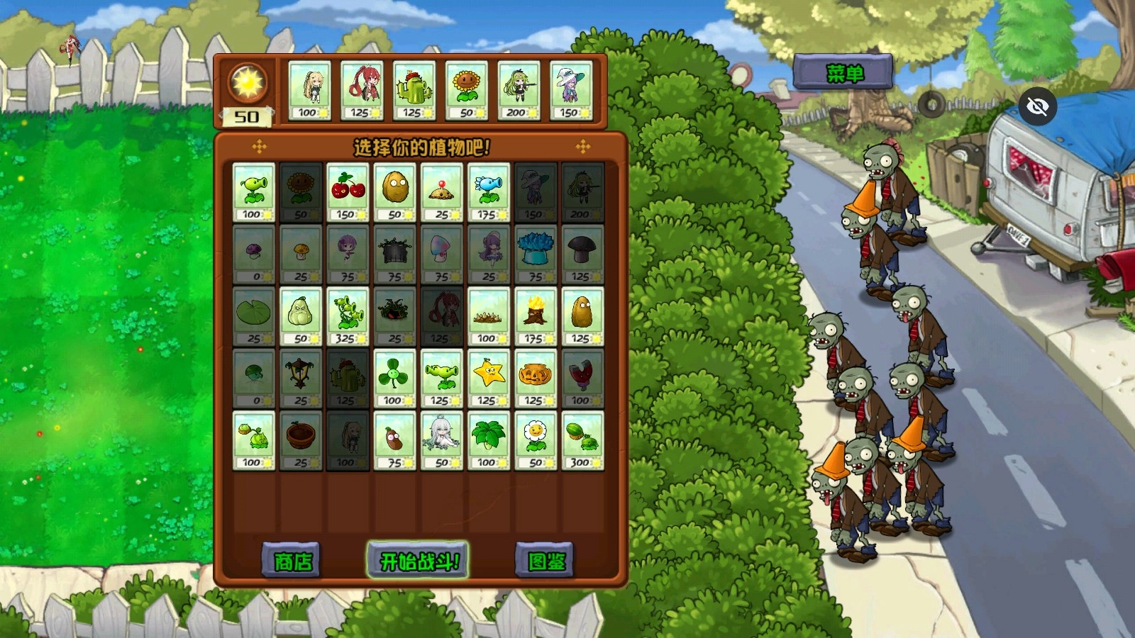1、进入游戏后选择好需要使用的植物,还有变换形象后的植物娘哦!