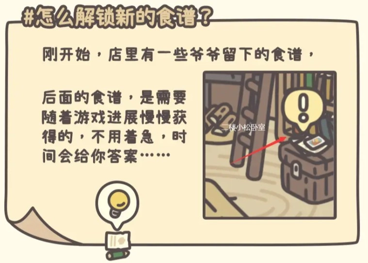 1、食谱解锁怎么解锁:食谱是日常烹饪必须的道具,玩家剧情中爷爷留下的食谱来解锁食谱。