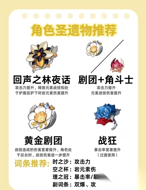 1、套装选择:可选回声之林夜话(攻击提升,护盾下岩伤加成)、剧团+角斗士(攻击+战技伤提升)、黄金剧团(战技伤+后台增伤),过渡用战狂(暴率显著提升)。