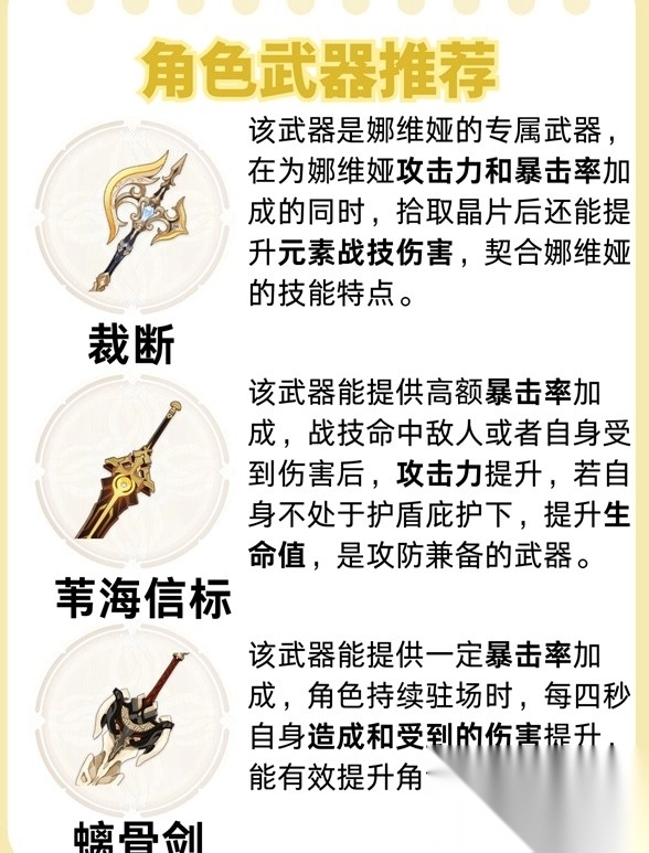 1. 专武优先选择:裁断(娜维娅专属),它能增加攻击力与暴击率,拾取晶片还能提升战技伤害,与娜维娅的技能机制完美适配。