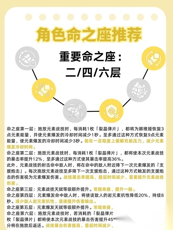 1. 核心命座:二、四、六层属于关键命座。一层能够缓解充能问题,三层与五层是常规提升,二层、四层、六层则强化输出与机制。
