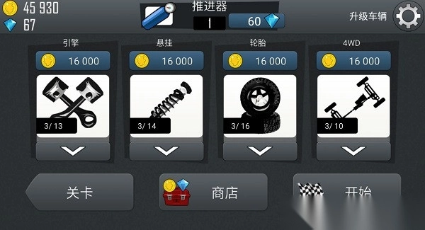 2、升级部件包括发动机、悬浮、轮胎和四轮驱动。