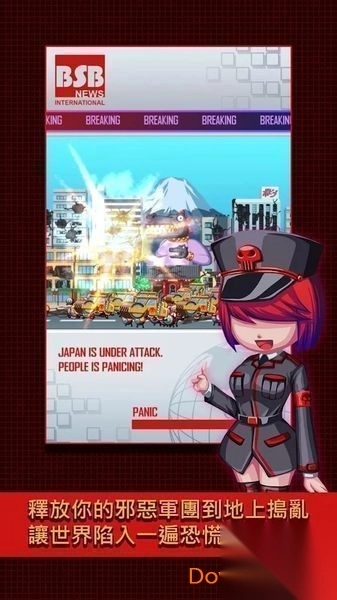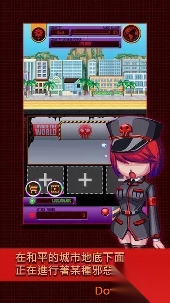 竖板的模拟经营游戏,在游戏中玩家需要打造自己的兵团来侵略人类,你可以通过创建地下采矿场和抓人类俘虏来增加资源,然后利用资源创建军事基地,购买武器装备,增加你的兵力,当你的兵力超过你所要侵犯的国家的防御兵力时,你就可以国家进行就侵略,同时需要注意的是侵略可以引发人类恐慌,只要恐慌条达到100%,这个国家就属于你啦!