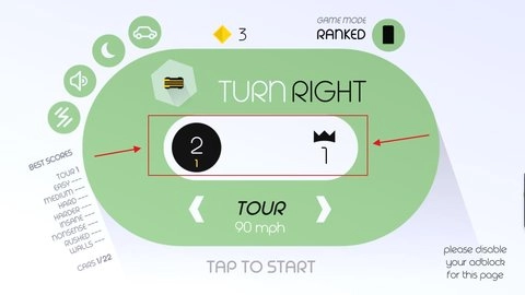 4、左侧数字代表漂移任务目标,右侧数字代表漂移次数最高记录,完成任务目标可以获得金块奖励。
