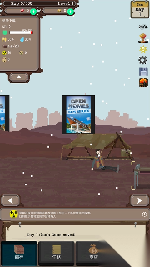 像素风末日沉浸:以复古像素风构建末日废土世界,独特的美术风格将核战后的荒芜具象化,搭配特殊天气效果,营造出逼真且充满危机感的沉浸式体验。