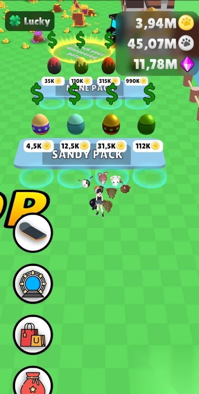 2、进入宠物蛋界面,点击“SANDYPACK”等蛋包,消耗对应货币,孵化获取新宠物。