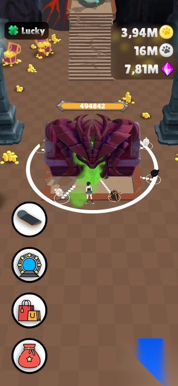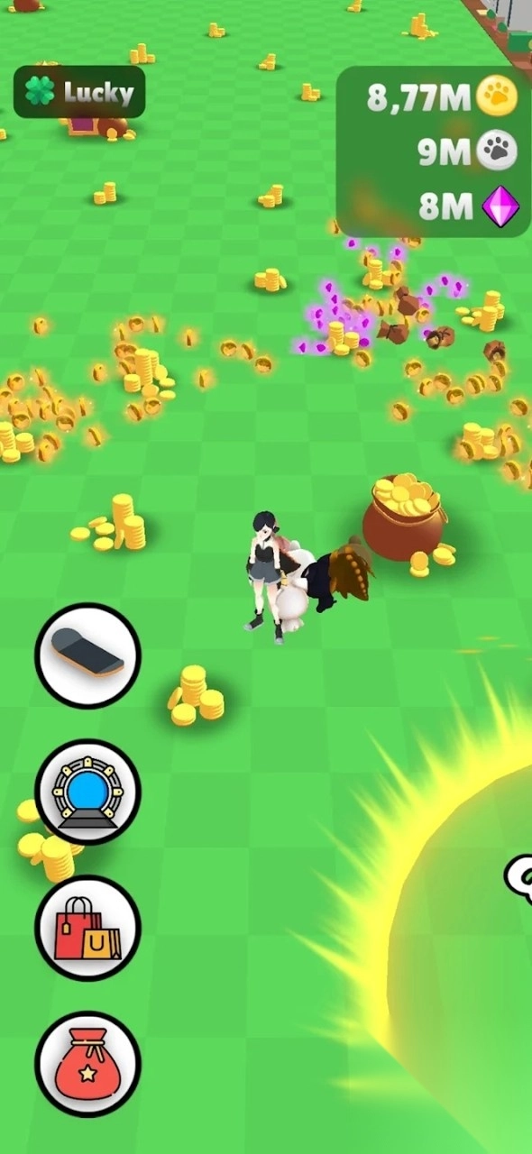 3、在金币场景,操控角色移动,带领宠物收集金币、宝箱,积累资源,提升宠物实力。