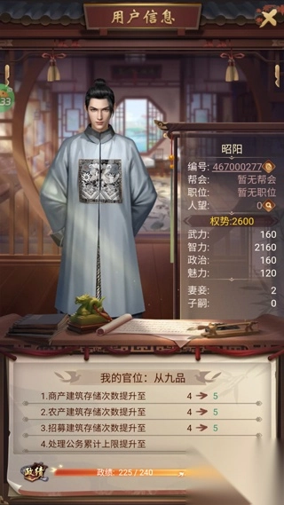 官职晋升: 积累足够的政绩和声望后,玩家可以参与升官考核,通过考核即可提升官职,解锁更多权限和玩法。