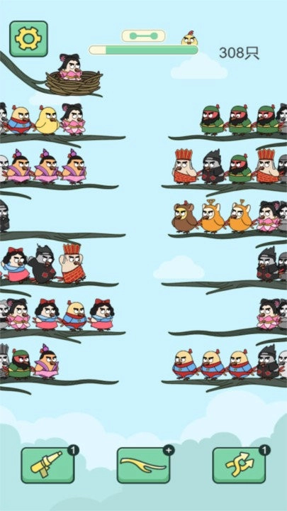 1、核心玩法要求观察树枝布局,通过拖拽将同色小鸟移动至同一树枝完成四只组队消除。