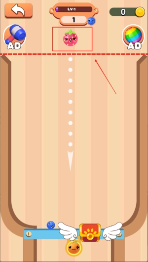 3、当相同的水果碰到就会合成变为更大的水果,每次合成都会获得积分,当积分足够即可过关。