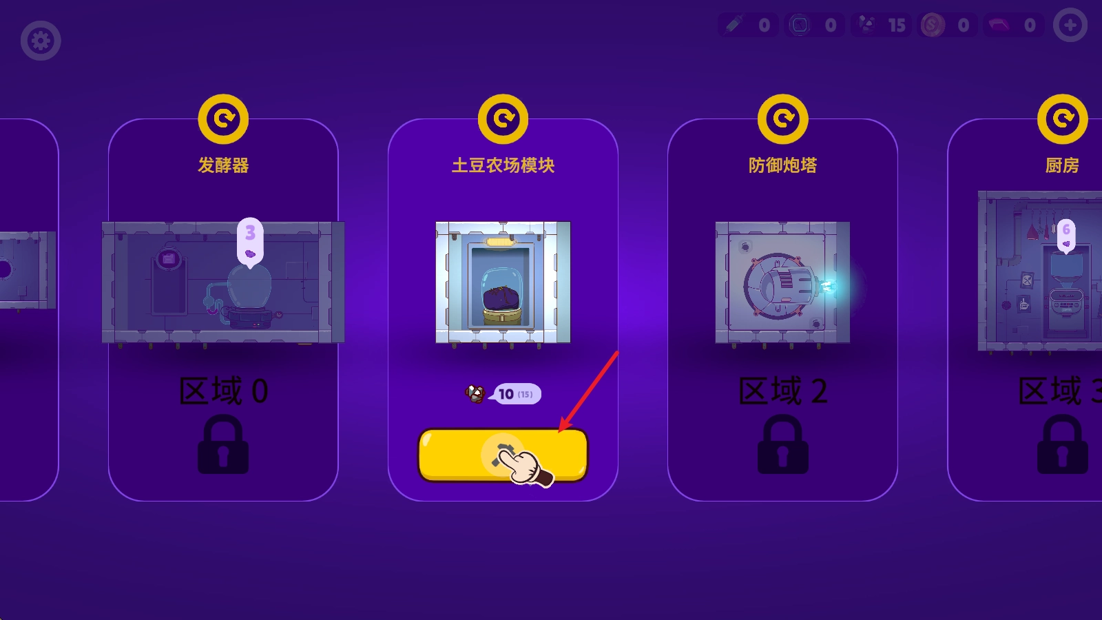 2、游戏分为了探索和建造两个部分,在基地内,我们可以挑选各种设施进行建设,选中后挑选绿色区域即可。